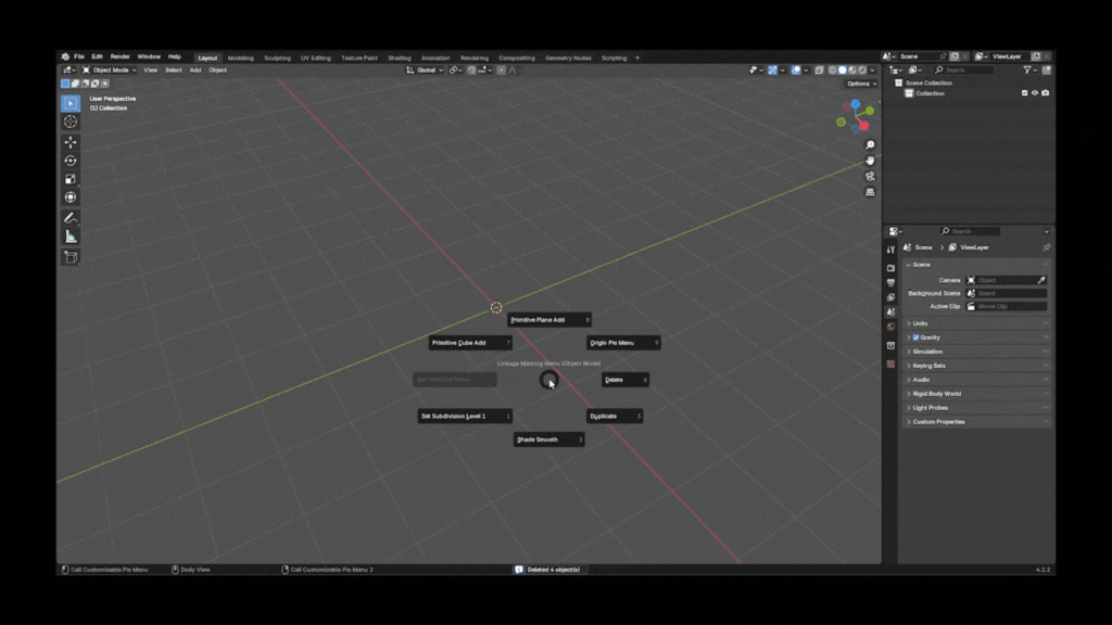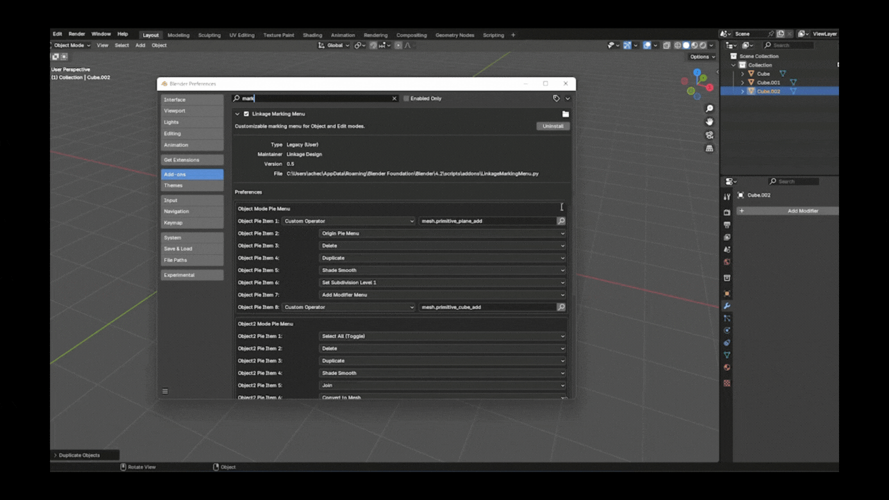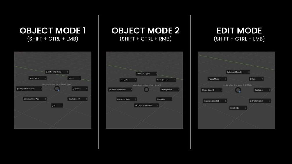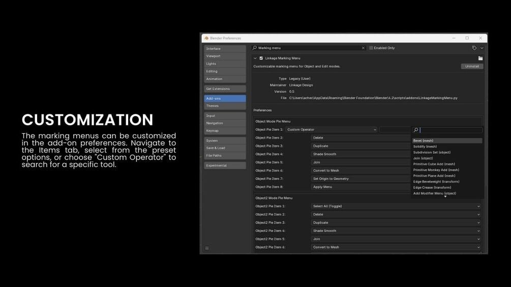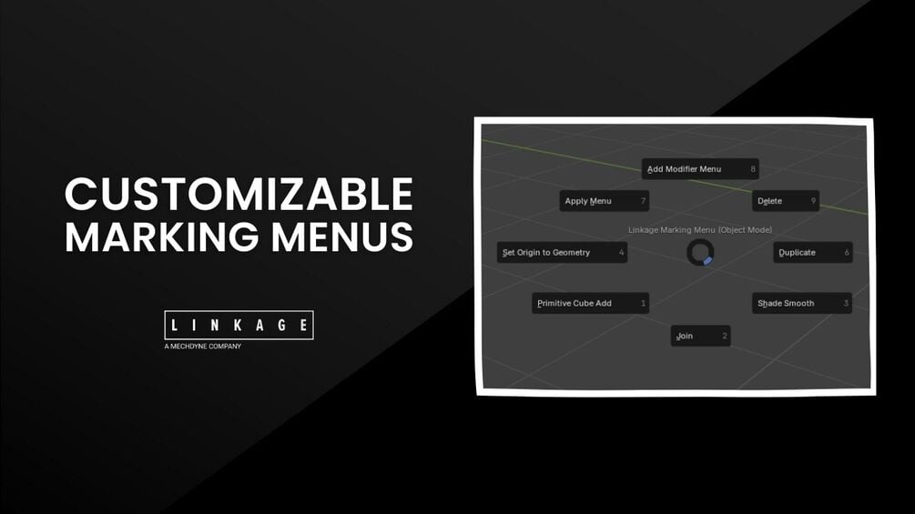Take control of your Blender workflow with Linkage Customizable Marking Menus! These intuitive quick-access menus let you activate tools directly in the viewport, saving time and eliminating the need for constant menu navigation. Fully customizable, they allow you to tailor your setup with your favorite tools or custom operators, making your workflow faster, smoother, and more efficient. Perfect for 3D artists and designers looking to boost productivity and stay in the creative flow.